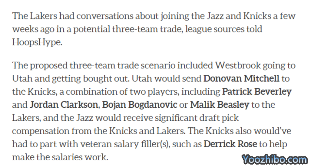 这笔交易的框架是威少前往爵士,然后被买断。爵士将米切尔送往尼克斯,贝弗利、克拉克森、博格达诺维奇、比斯利中的两位被送往湖人,爵士从尼克斯和湖人得到相当可观的首轮签作为补偿,而尼克斯为了配平薪水,还要送出罗斯这样的老将。