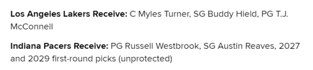 方案3:湖人送出威少、里夫斯、2027年首轮和2029年首轮(均为不受保护),得到步行者的特纳、希尔德、麦康奈尔