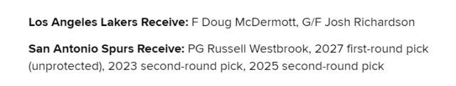 方案5:湖人送出威少、2027年不受保护首轮、2023年和2025年的次轮,得到马刺的迈克德莫特和约什-理查德森