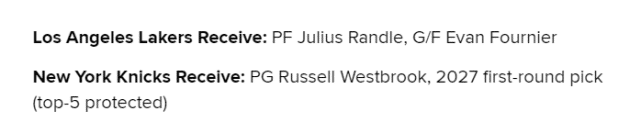 方案4:湖人送出威少和2027年首轮签(前五保护),得到尼克斯的兰德尔和富尼耶