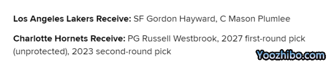 方案1:湖人送出威少、2027年不受保护首轮和2023年次轮签,得到黄蜂的海沃德和普拉姆利