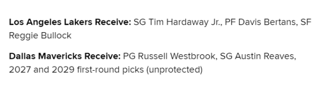 方案2:湖人送出威少、里夫斯、2027年首轮和2029年首轮(均为不受保护),得到独行侠的小哈达威、贝尔坦斯和布洛克