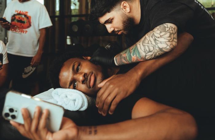 从布朗尼纹身的现场照可以看出,布朗尼在两个手腕上纹上了一些英文,好像还在脖子后面纹了一些图案,纹身期间,布朗尼表情淡定以及咧嘴大笑,十分享受纹身的过程。