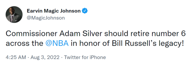 此前有记者建议NBA退役6号球衣,来向比尔-拉塞尔致敬,如今,湖人名宿魔术师也提出了这个建议,并得到不少记者的转发。他写道:“为了纪念拉塞尔的精神遗产以及成就,萧华应该在NBA退役6号球衣。”