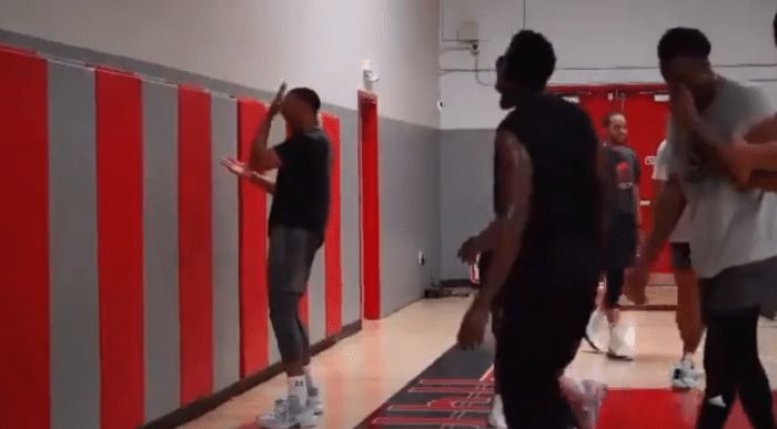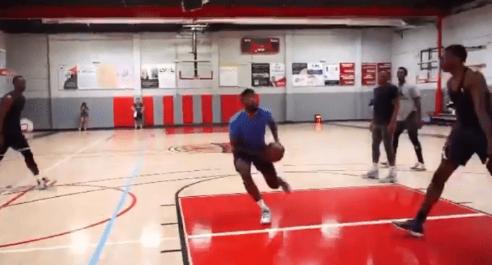 在一场公开训练赛上,快船球星保罗-乔治、湖人球星威少、热火球员奥拉迪波和国王球员哈里森-巴恩斯一起打比赛,期间乔治和威少的暴扣太疯狂。