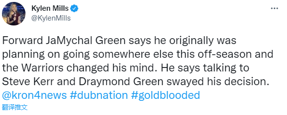 来源:JRS直播08-02 09:49JRS直播08月02日讯 ,勇士官方宣布,球队正式签下前锋杰迈克尔-格林,晒照欢迎J-格林加盟球队,还晒格林昔日拥有库里的赛场照,并且配文写道:从对手到成为队友,欢迎加入我们;J-格林本人透露科尔和追梦的招募改变了他的决定,已经准备好了和格林一起干脏活累活。