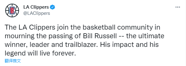 快船官方:快船加入篮球大家庭,向比尔-拉塞尔的逝世表示哀悼。他是终极赢家、领袖和开拓者。他的影响和传奇将会永存。