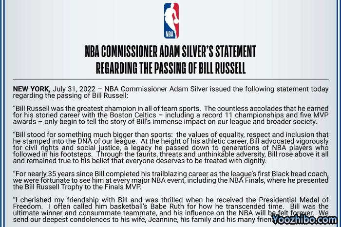 “拉塞尔对我们的意义远远大于体育本身:平等、尊重和包容的价值被他深深烙印在我们联盟的基因中。在他生涯的巅峰期,他积极主张民权和社会正义,这是他为未来跟随他脚步的NBA球员们留下的巨大财产。在嘲笑、威胁和无法想象的逆境中,拉塞尔挺身而出,坚持自己的信仰,那就是人人值得被尊重对待。