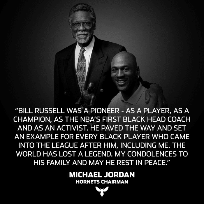 乔丹缅怀拉塞尔,发声悼念:比尔-拉塞尔是一个先驱者,作为球员、冠军、联盟首位黑人主教练和社会积极人士。他为未来的NBA球员铺设道路,为他之后进入NBA的每一位黑人运动员设立榜样,包括我。这个世界失去了一位传奇,我向他的家人们送去悼念,望逝者安息。