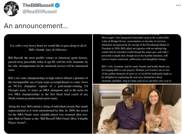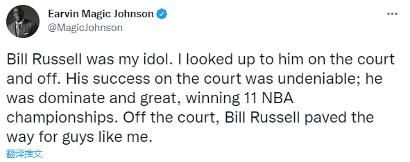 比尔-拉塞尔个人推特发布讣告:我们怀着沉重的心情向比尔的所有朋友、粉丝以及关注者们转达:比尔-拉塞尔,美国体育史上冠军最多的运动员,今天在他的妻子珍妮身旁安详离世,享年88岁。他的追悼会安排将很快公布。