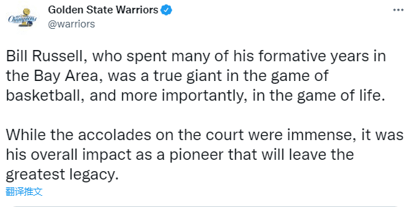 勇士官推:比尔·拉塞尔在湾区度过了他的许多成长岁月,他是篮球运动中的真正巨人,更重要的是,在人生的比赛中。不仅在球场上的荣誉是巨大的,而且他作为先驱者对世界的整体影响是最伟大的遗产。