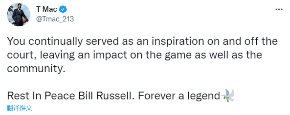 麦迪发推:你在球场内外一直是一个灵感来源,对比赛和社区都产生了影响。安息吧,比尔·拉塞尔。永远是一个传奇