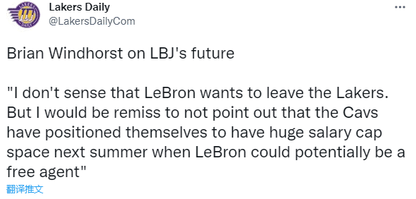 名记Brian Windhorst表示:勒布朗不想离开湖人队,但我要指出的是,骑士队已经将为明夏创造了巨大的薪资空间,勒布朗有可能成为自由球员。