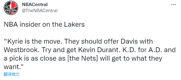 露天看台记者Eric Pincus报道,联盟内部人士表示:欧文就是(湖人)该去交易得到的球员。湖人应该提供浓眉加上威少的报价,来争取得到杜兰特(加上欧文)。用杜兰特换回浓眉加一个选秀权也最接近篮网想要的。