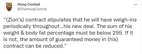 换言之,锡安需要定期接受检查以及称重,若体重超标,他的薪水就会减少。