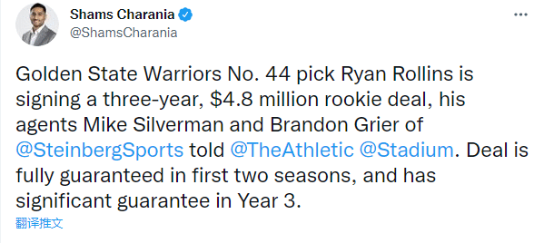 名记shams报道,勇士已经和今年44号秀瑞恩-罗林斯签下3年480万美元的新秀合同,合同前两年是完全保障的,第三年大部分保障;勇士训练营大名单增至18人,罗林斯成为勇士新赛季第13人。