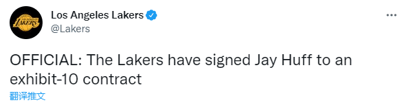 来源:JRS直播07-28 10:12JRS直播07月28日讯 ,湖人官宣再签一人,湖人官方宣布,球队正式与中锋杰伊-胡夫签下了一份Exhibit-10合同,这是一份一年无保障训练营合同,湖人训练营大名单增至19人,仅剩最后一个名额。
