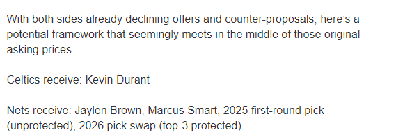 此前凯尔特人曾想篮网报价杰伦-布朗、怀特和一个选秀权,篮网拒绝如此报价并且要价布朗、斯玛特、一名轮换球员和多个选秀权,被绿军拒绝;美记Evan Sidery认为双方会继续谈判,然后折中达成交易,建议绿军4换1交易引援杜兰特。