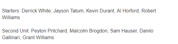 假如绿军与篮网交易达成,Evan Sidery预测凯尔特人新赛季首发五虎是杜兰特、塔图姆、怀特、霍福德和罗伯特-威廉姆斯;替补阵容是普理查德、布罗格登、豪瑟、加里纳利和格兰特-威廉姆斯。