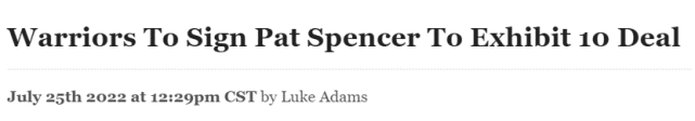 来源:JRS直播07-26 10:21JRS直播07月26日讯 ,据名记Keith Smith报道,消息人士透露,勇士已与后卫帕特-斯宾塞签下一份无保障的训练营合同。据悉,斯宾塞签下的是一份Exhibit 10合同。