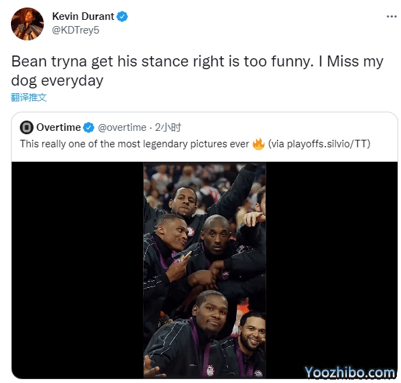 美媒over time晒出美国男篮梦十队夺得奥运金牌后摆POSE合影的视频,并且配文写道:有史以来最具传奇色彩的镜头之一;杜兰特转发并且直言:我每天都在想念科比。