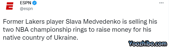 来源:JRS直播07-25 09:19JRS直播07月25日讯 ,据美媒ESPN报道,前湖人总冠军成员斯拉瓦-梅德维登科正在出售他的两枚总冠军戒指,目的是为他的祖国乌克兰筹集资金;他跟随科比和奥尼尔夺得两次总冠军,备受科比的喜爱
