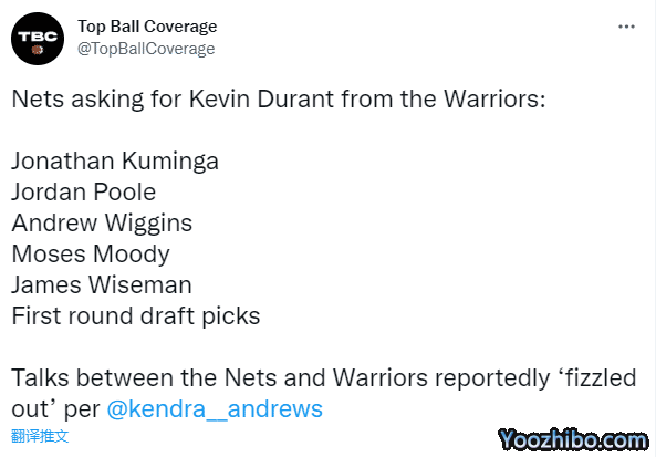 来源:JRS直播07-23 15:16JRS直播07月23日讯 ,杜兰特交易处于搁置的状态,由于篮网要价太高,勇士与他们谈判失败;据NBA记者Kendra Andrews透露,篮网向勇士要价库明加、普尔、维金斯、穆迪、怀斯曼和一个首轮选秀权,篮网索要杜兰特1换6被勇士拒绝,双方交易已经谈崩。