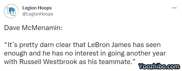此前名记海耶斯曾报道詹姆斯、威少和浓眉三巨头进行了电话会议,并且彼此承诺并发誓一起夺冠;如今ESPN名记Dave Mcmenamin表示:很明显勒布朗早就受够了,他没有兴趣和威少作为队友再打一年。