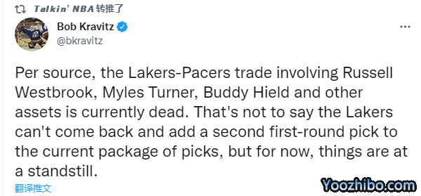湖人一直想要引援希尔德,本想用威少+一个首轮签从步行者得到希尔德和特纳,湖人报价遭步行者拒绝,步行者提高要价并且向湖人再要一个首轮签;换言之,湖人需要送出2027年和2029年两个首轮签,3换2才能与步行者达成交易,湖人不愿再加首轮签,因此交易谈崩。