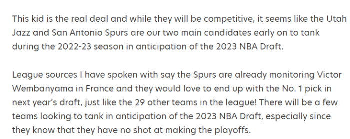 据NBA记者Brett Siegle报道,现在的一些迹象表明马刺和爵士从新赛季开始就会摆烂,他们的关注点不是22-23赛季战绩,而是2023年选秀。此外,据消息人士透露,马刺已经去法国考察文班亚马,他们很想拿到明年的状元签。