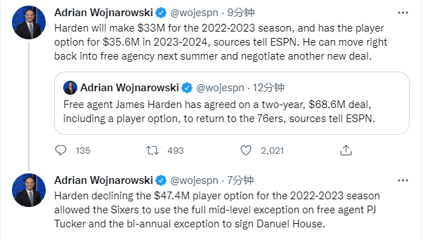 名记还透露哈登此前拒绝了执行4740万美元的球员选项以及降薪1400万美元的真因,哈登此举是为了让76人可以使用完整中产特例签下PJ-塔克(3年3320万美元)以及用双年特例签下豪斯(2年850万美元)。