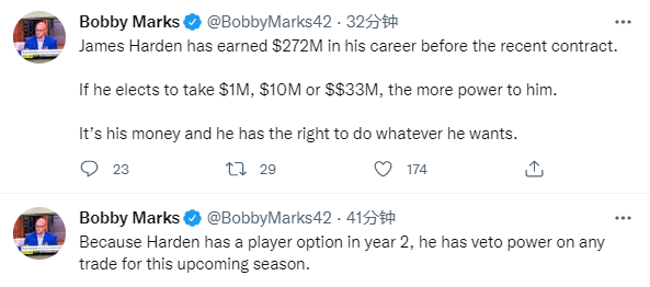 薪资专家Bobby Marks表示,由于哈登在23-24赛季的合同含球员选项,所以他在新赛季(22-23赛季)拥有交易否决权,可以拒绝任何交易。