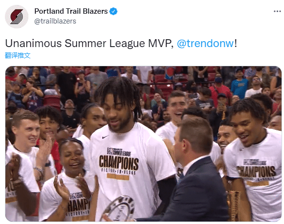 夺冠后,沃特福德夺得夏联总决赛MVP,全队为他疯狂鼓掌庆祝,开拓者官方第一时间祝贺他们夺冠以及沃德福德夺得夏联决赛MVP。
