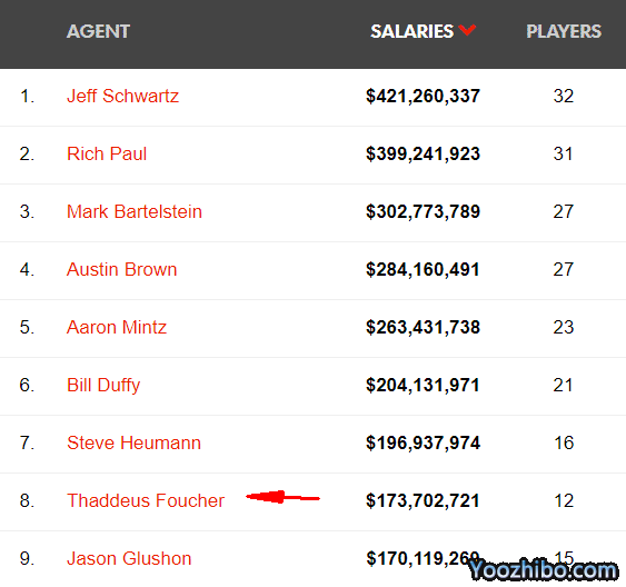 首先,萨德-福切尔在NBA圈内还是颇有名气。在威少和他分手前,福切尔在NBA经纪人的年度排名中位居第八,这份年度排名的标准是经纪人签约球员的总年薪。算上威少,福切尔一共签有12位NBA球员,2022-23赛季的总年薪是1.737亿美元。