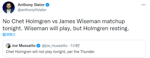 除了迪昂外,雷霆队的特雷-曼恩因左脚踝扭伤缺席今天对阵勇士的比赛;雷霆榜眼也缺席与勇士的比赛,勇士记者Anthony Slater发推写道:今晚看不到霍姆格伦对决怀斯曼了,怀斯曼参加比赛,但霍姆格伦休战。