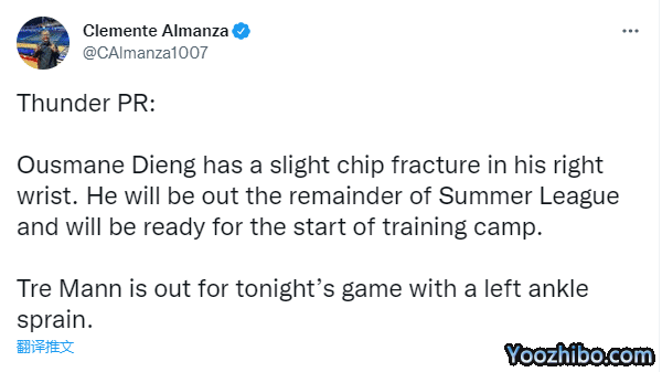 据雷霆记者Clemente Almanza报道,雷霆官方宣布,球队今年的首轮11号新秀奥斯曼-迪昂的右手腕轻微骨折,他将因伤缺席夏联剩余比赛;预计他将会为训练营的开始而做好准备。