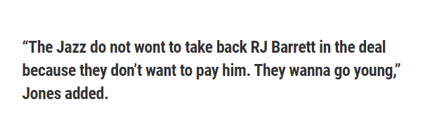 爵士向尼克斯索要以交易的8个首轮签中的6个,外加所有的优秀年轻球员;并且爵士不想要RJ-巴雷特,他们不想要他的薪水,他们想要变得年轻。