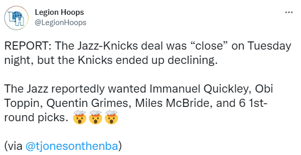 据Tony Jones报道,爵士向尼克斯索要奎克利、托平、格莱姆斯、麦克布莱德和6个首轮选秀权,想用米切尔1换10被尼克斯拒绝,双方暂时谈判失败;不过他们曾接近达成交易。