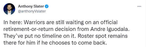 勇士仍旧在等待伊戈达拉做出退役或者回归的决定,勇士没有设置等待的最后期限,如果伊戈达拉选择继续征战,他会是勇士新赛季大名单上的一员。