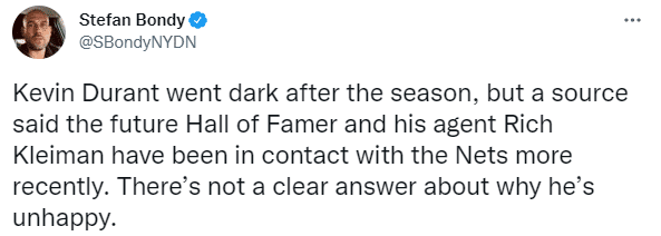 据篮网随队记者Stefan Bondy报道,杜兰特的确处在“失联”状态,但是消息人士称,他和他的经纪人最近一直在和篮网保持联系;篮网知道杜兰特对现状有所不满,但他们仍然对他申请交易感到惊讶。
