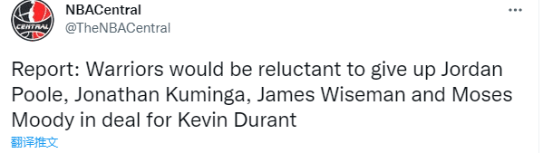 Hoopshype名记Michael Scotto谈到了杜兰特重回勇士的可能性,透露勇士不愿意在关于杜兰特的交易中放弃普尔、库明加、穆迪、怀斯曼等年轻球员,他们也不会把维金斯放在关于杜兰特的交易报价中。