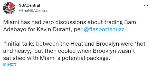 阿德巴约还没有向热火要求不被牵扯进杜兰特交易的保证。值得一提的是,如果阿德巴约被交易至篮网,那么篮网需要交易本-西蒙斯。