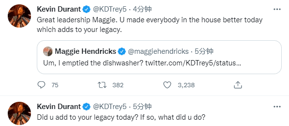 有网友回应:我清洗了洗碗机?杜兰特回复:伟大的领袖。你今天让家里的每个人都变得更好,这增加了你的地位。