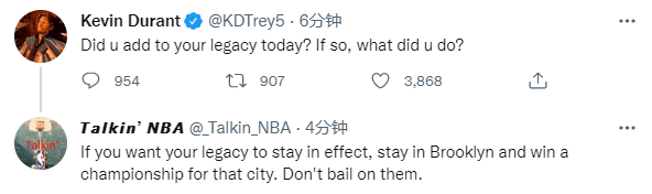 美媒Talkin NBA第一时间回复:如果你想要你的历史地位继续提高,那就待在篮网并且为这座城市赢得总冠军,不要逃避了。