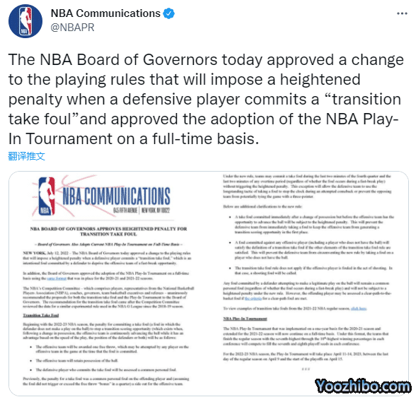 来源:JRS直播07-13 17:22JRS直播07月13日讯 ,NBA官方正式出台新规,联盟董事会已经通过了新赛季的快攻犯规新规,新规定规定,出现快攻犯规时,进攻方将获得一罚一掷;官方也正式宣布附加赛成为常规赛的一部分;季中锦标赛最早23-24赛季举办。