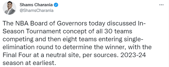 据名记shams报道,NBA理事会在今天讨论了赛季锦标赛的计划,即所有30支球队都参加比赛,然后8支球队进入单场淘汰赛,四强在中立场比赛,然后确定最终的胜利者,季中锦标赛最早2023-24赛季实施。