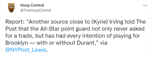 据篮网记者Brian Lewis报道,接近欧文的消息人士透露,欧文从未要求离队;欧文交易流言是由于杜兰特申请离队导致的,外界都想篮网交易欧文,但欧文选择执行球员选项;消息人士还透露无论篮网有没有杜兰特,欧文都想继续为篮网效力。