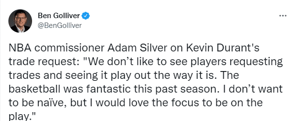 杜兰特申请离队的闹剧已经持续将近两周,但篮网与其他队的交易谈判并没有实质性的进展;对于杜兰特想走这件事,联盟总裁正式回应,表示:球员和球队代表总是关门谈话,但我们不希望看到球员要求交易,我们不想看到这样的结果,希望球员能够专注于比赛。