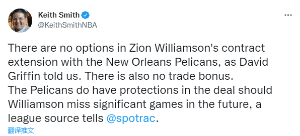 据名记Keith Smith报道,锡安与鹈鹕此前达成的顶薪提前续约合同中含与出场挂钩的保障条款,锡安合同中不含有任何球队选项,没有球员选项也没有交易保证金。