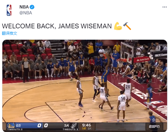 2021年4月11日,在勇士与火箭比赛中,怀斯曼遭遇半月板伤病,因伤连续伤停15个月;如今怀斯曼终于伤愈归来,代表勇士出战夏季联赛,NBA官方欢迎怀斯曼回归。